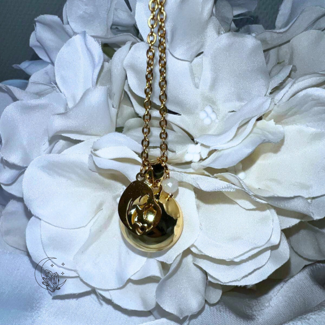 La bola de grossesse, ou "bola mexicain", est un pendentif sphérique traditionnel porté par les femmes enceintes. Originaire d'Indonésie et du Mexique, il contient un petit xylophone émettant un doux tintement apaisant pour le bébé à partir de la 20ème semaine de grossesse. Fabriqué en argent, or, cuivre ou acier inoxydable, il se porte sur un long collier reposant sur le ventre. Souvent, il contient aussi des pierres naturelles de lithothérapie, réputées pour leurs propriétés bénéfiques, et des charms significatifs ajoutant une touche personnelle et symbolique.