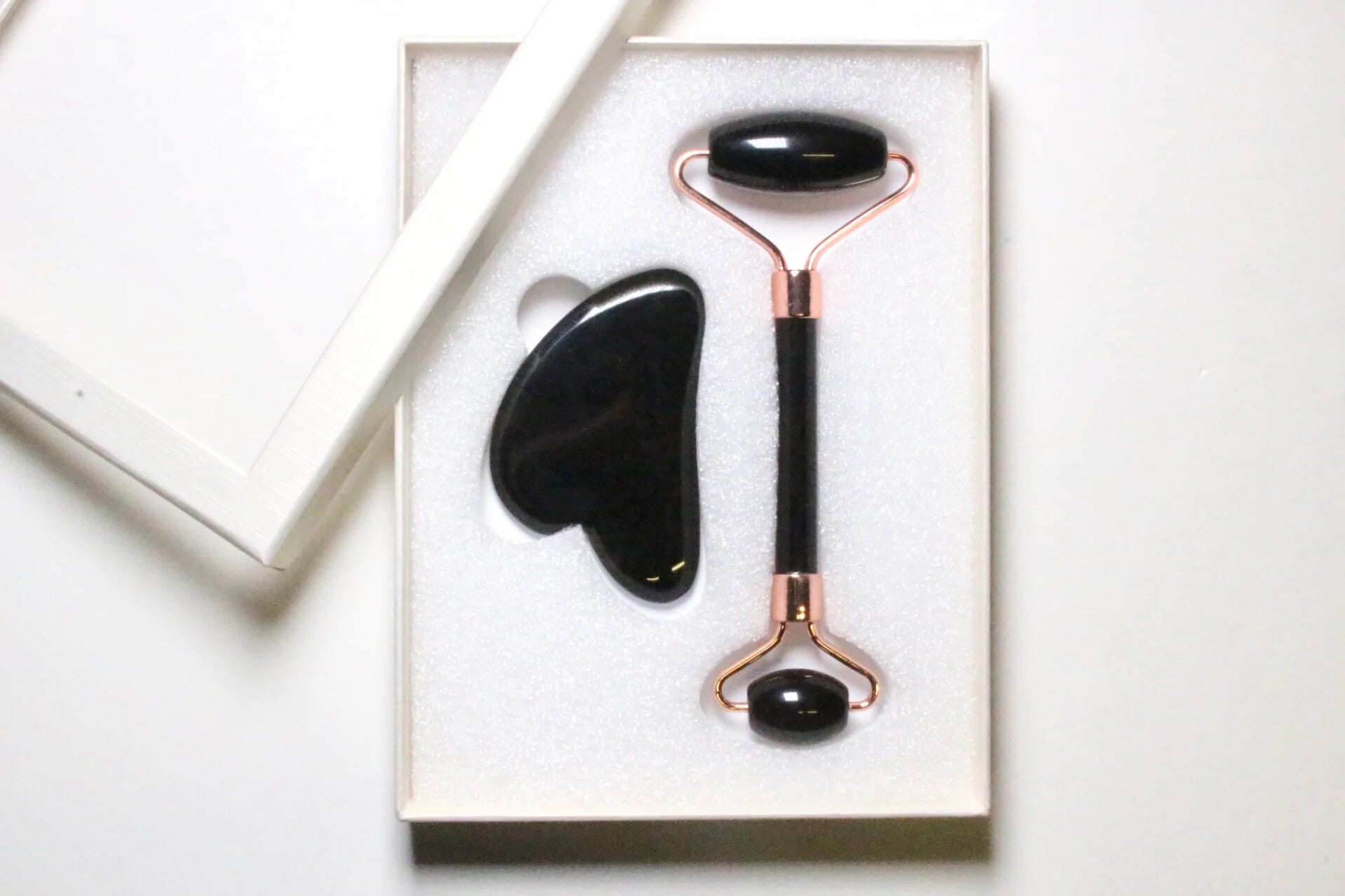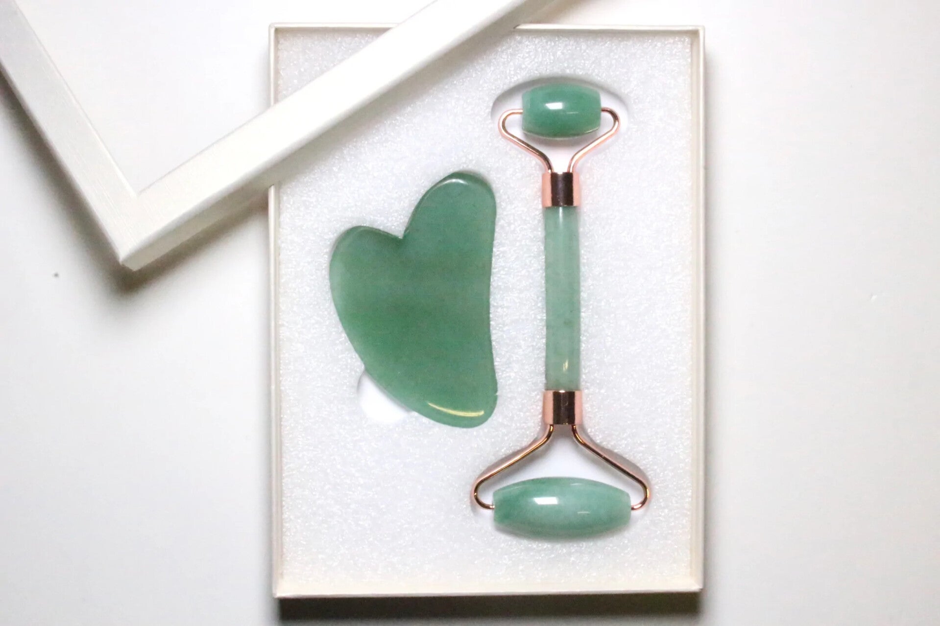 Coffret-cadeau Gua sha et Rouleau de massage en Quartz rose en pierre naturelle :