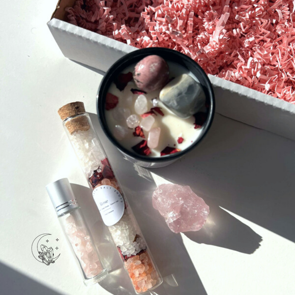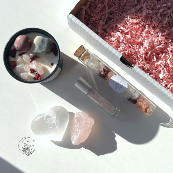 Le quartz rose, la rhodonite et la pierre de lune créent une énergie douce et chaleureuse qui vous aide à abandonner vos peurs, vos soucis et vos angoisses. En tant que pierre d'amour universel, ces cristaux vous aident également à développer des sentiments d'amour-propre et de dignité.